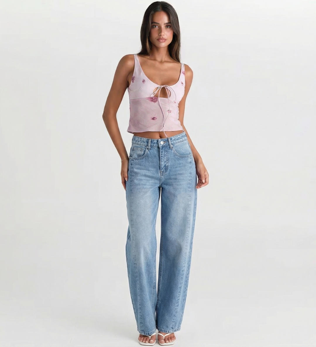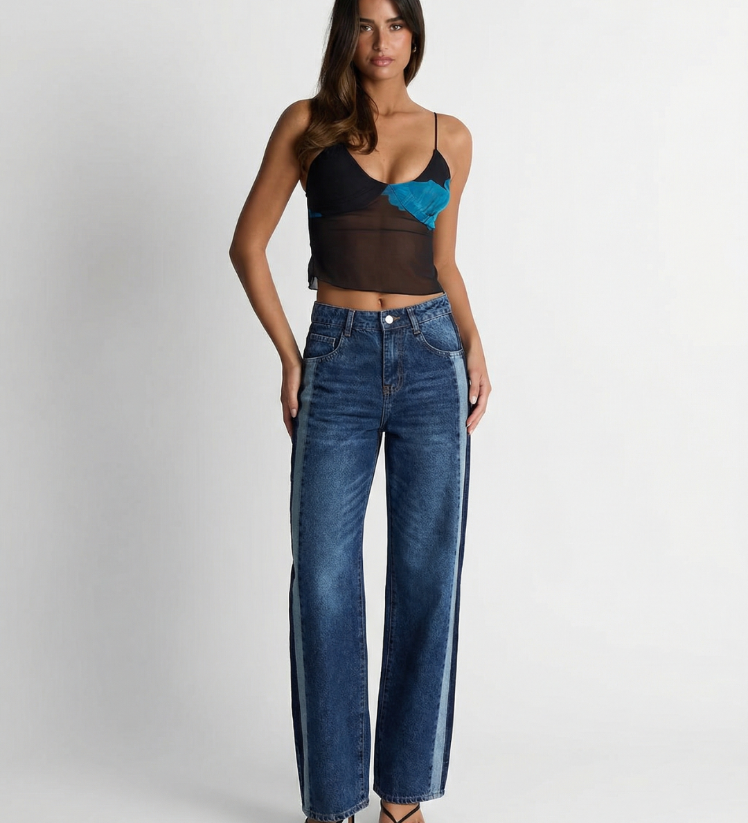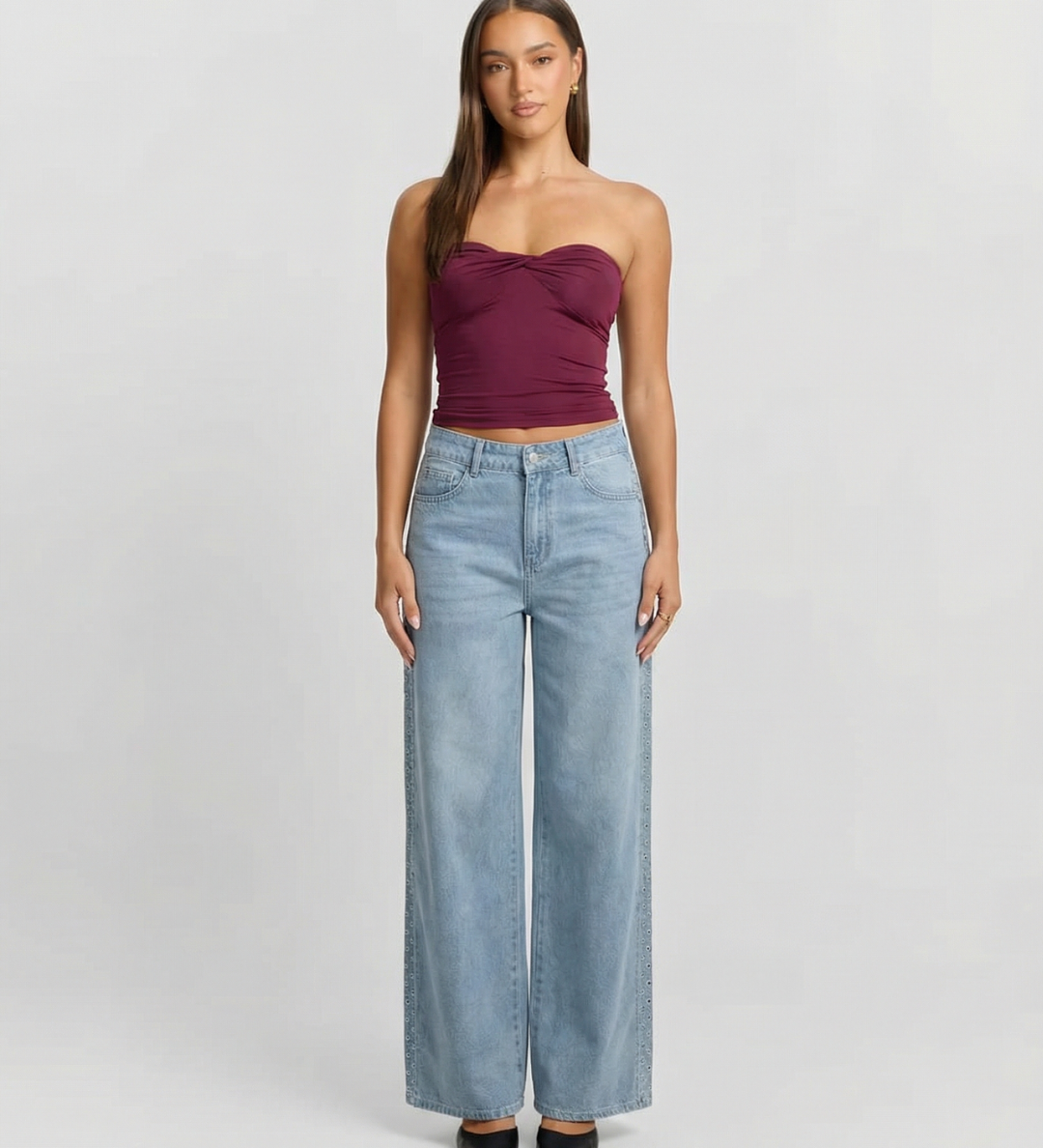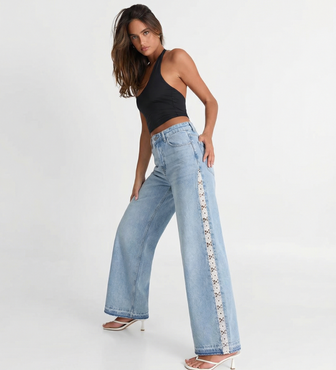 High Waist Wide Leg Denim Jeans with Side Detail