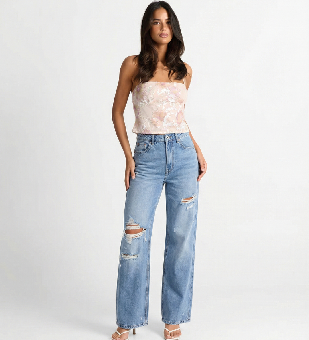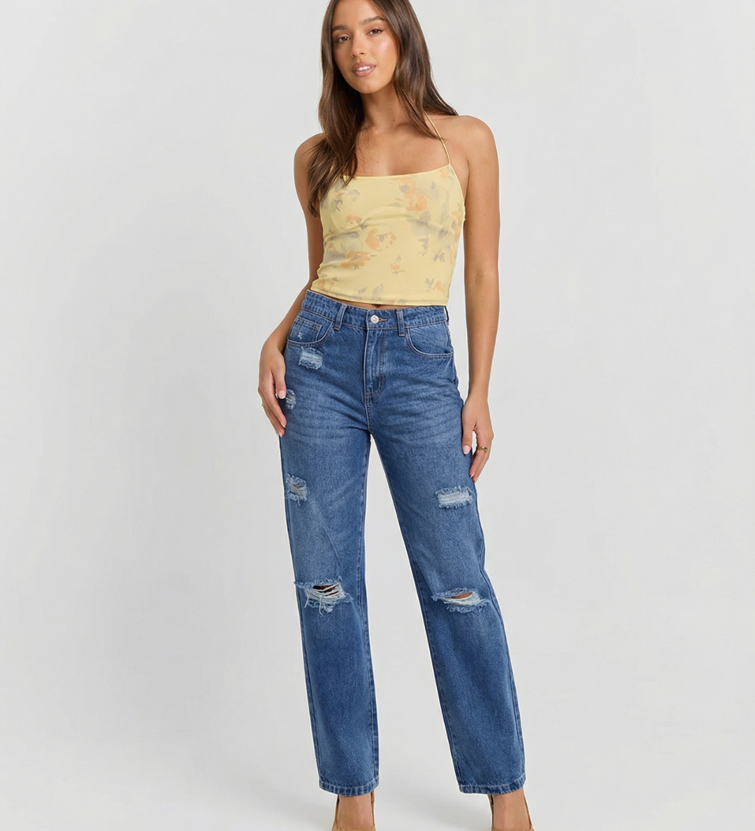 High Waist Straight Leg Ripped Denim Jeans