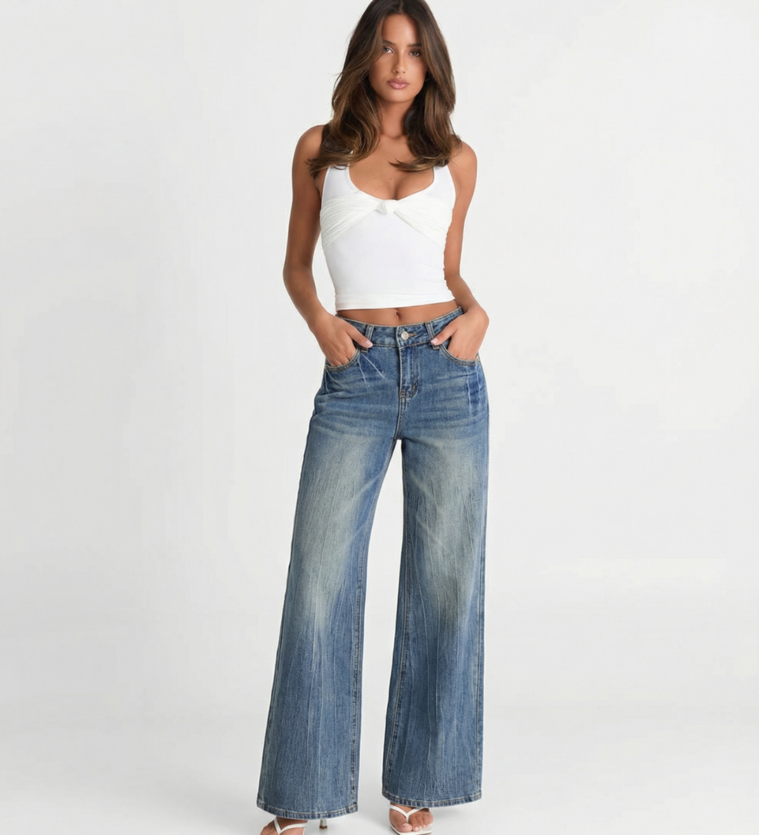 High Waist Wide Leg Denim Jeans with Vintage Wash