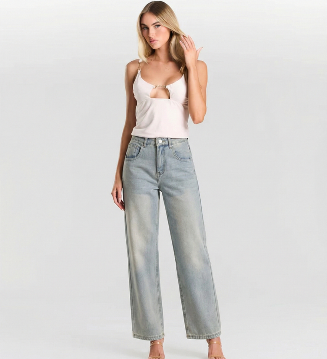 High Waist Straight Leg Denim Jeans with Light Blue Wash