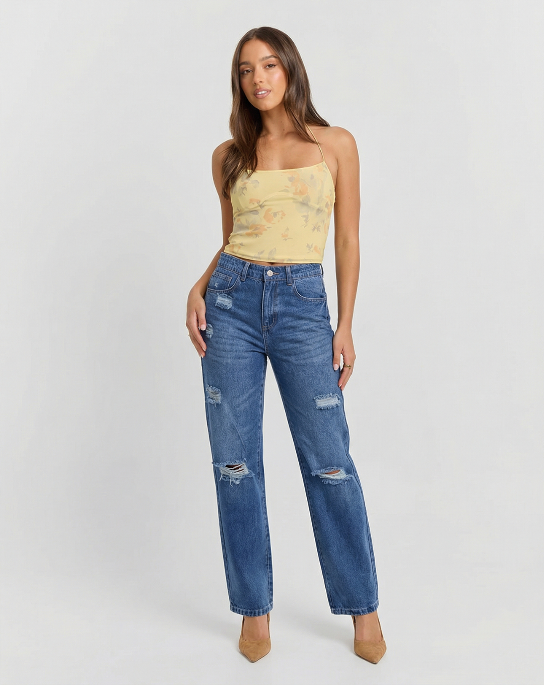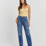 Perfect for off-duty outfits and styled casual looks, these jeans pair beautifully with fitted tops, strapless silhouettes, blouses, or relaxed shirts. The wide leg design adds movement and contemporary appeal, while the ripped accents introduce texture and personality without overwhelming the design. Whether styled with heels for a fashion-forward outfit or worn with flats or sneakers for an easy everyday vibe, these jeans adapt seamlessly to different occasions.
