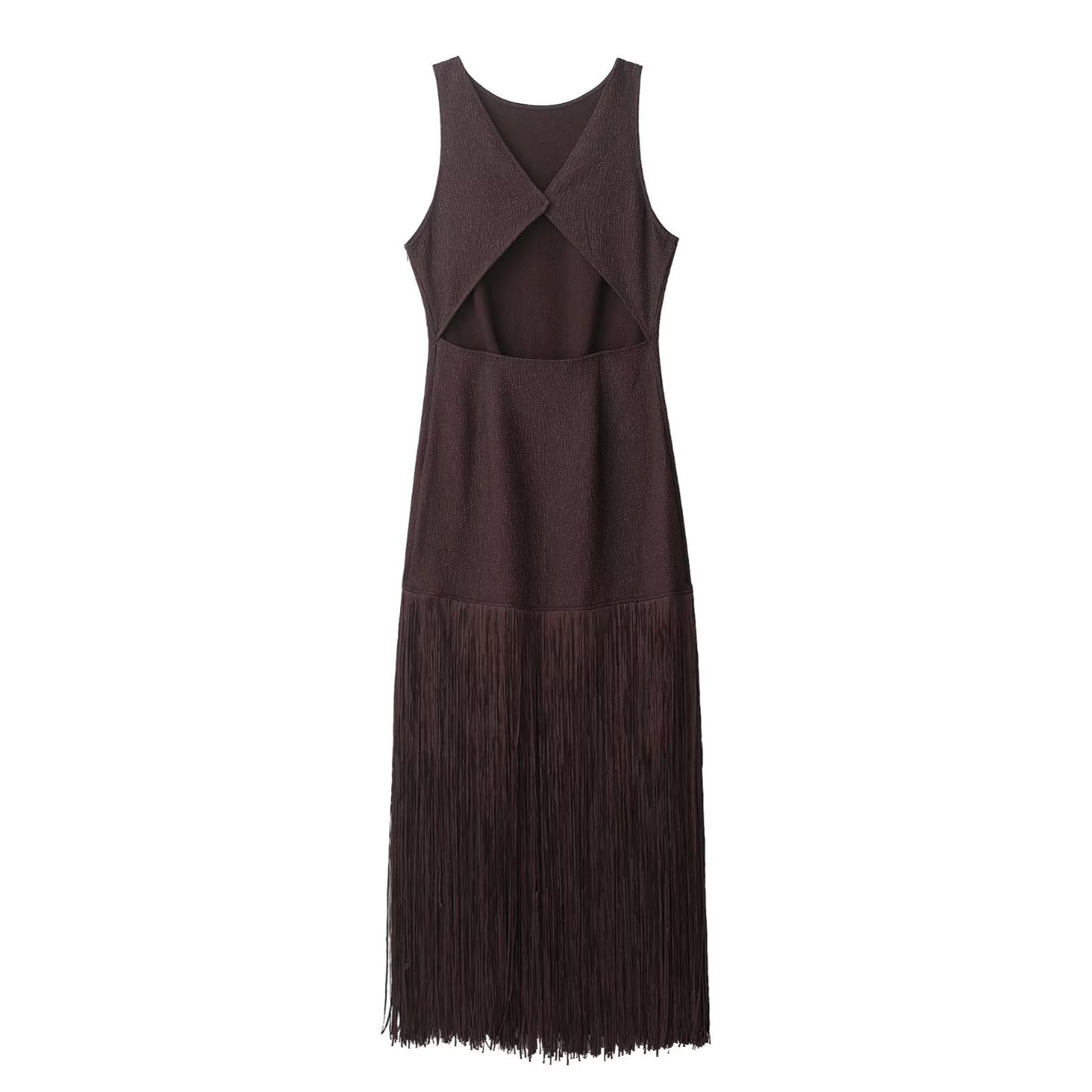This women’s sleeveless fringe hem maxi dress is designed to make a bold statement with elegant movement and modern allure. Featuring a sleek, body-skimming silhouette, this dress highlights the figure while remaining comfortable and easy to wear. The sleeveless design creates a clean and refined look, while the open back detail adds a striking, contemporary edge that elevates the overall style.